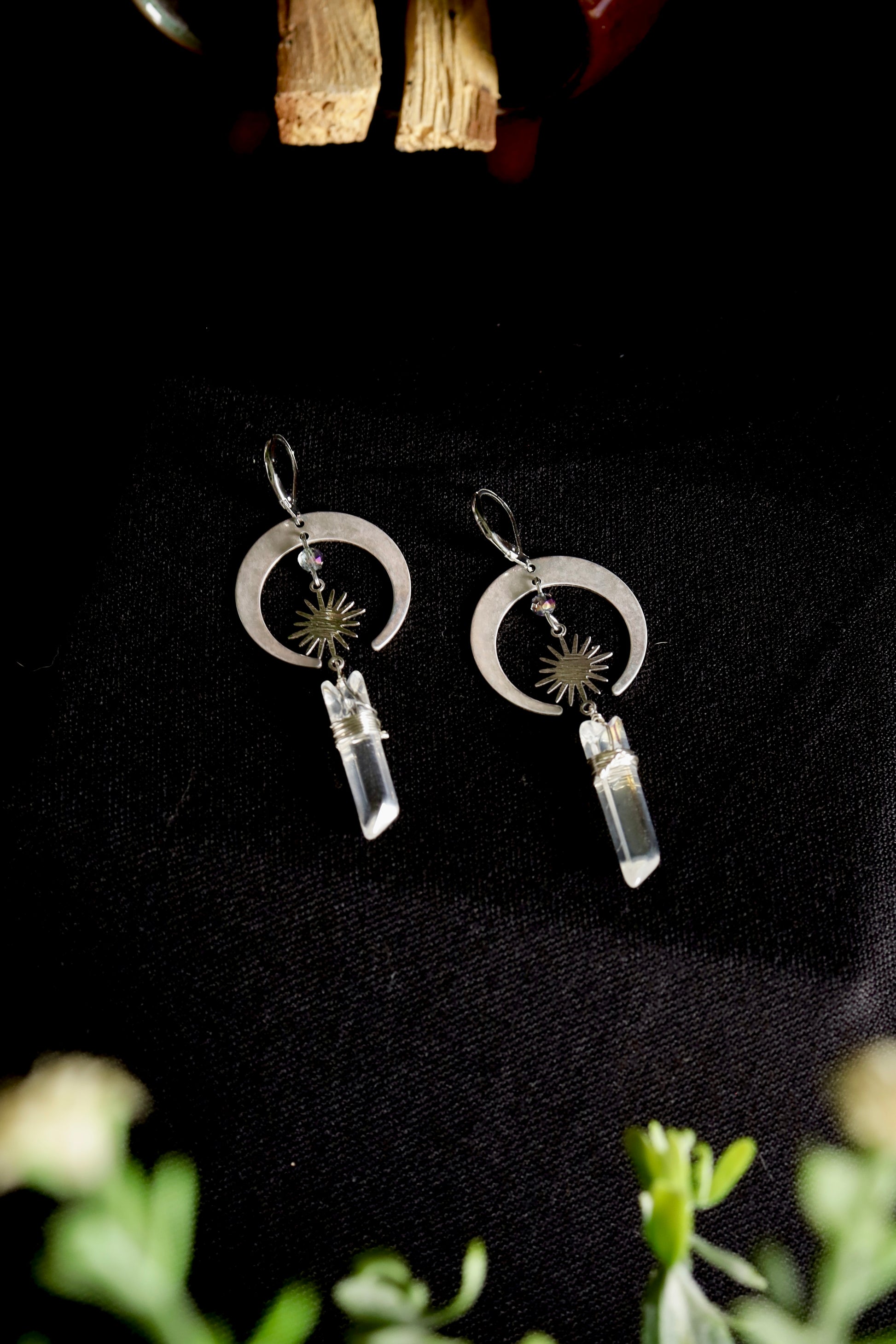 Estos aretes combinan el poder del Cuarzo Cristal con símbolos celestiales, creando un amuleto de belleza y protección. El cristal maestro, conocido por amplificar la energía y purificar el aura, se une a la luna y el sol como recordatorio de tu conexión con el universo y tu propia luz interior.