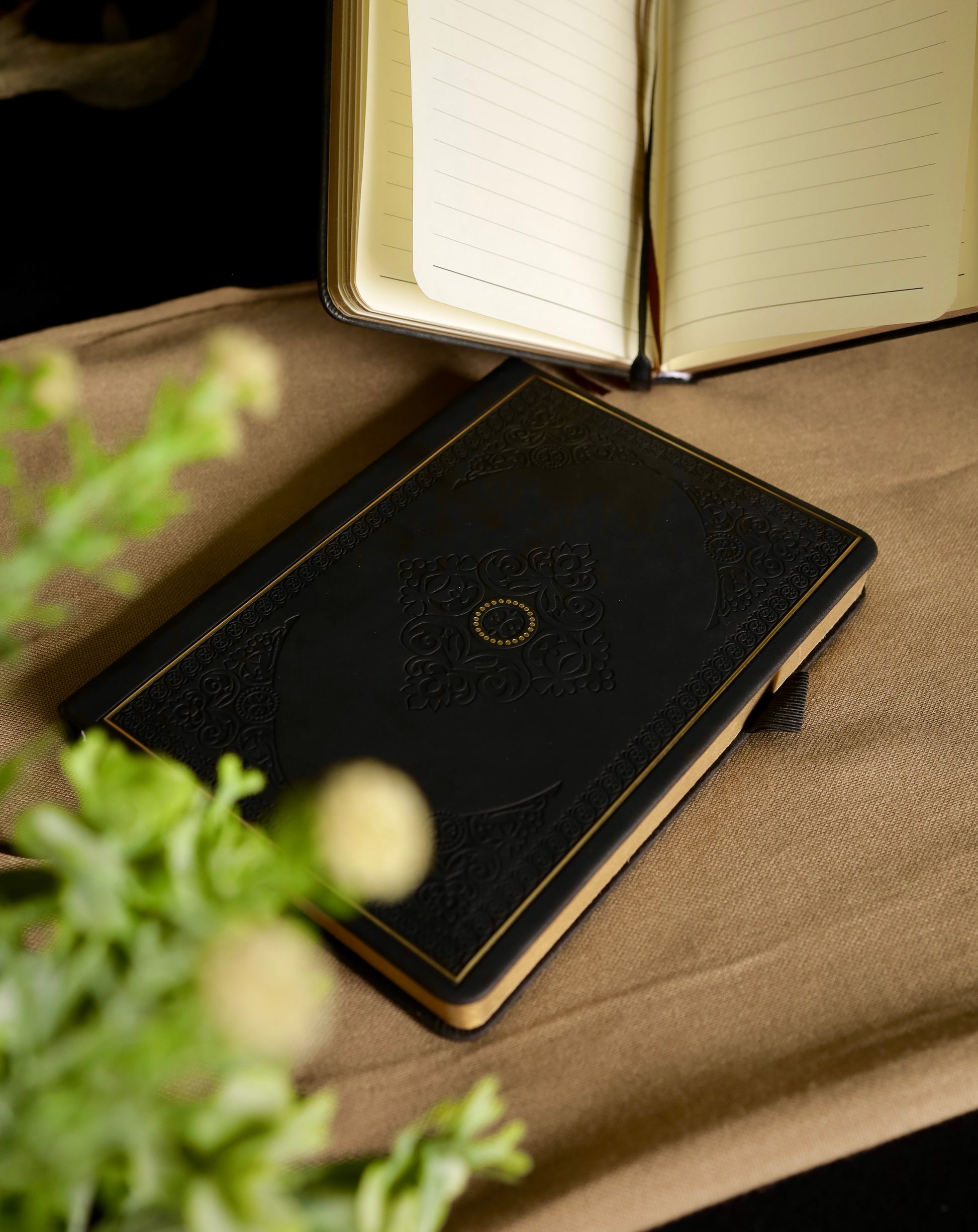 El Cuaderno de Manifestación Nocturna está inspirado en la energía del misterio, la introspección y el poder interior. Su tapa negra con grabados y detalles dorados representa la sabiduría oculta y la alquimia interna, perfecta para quienes desean plasmar su magia, reflexiones y procesos de transformación personal.