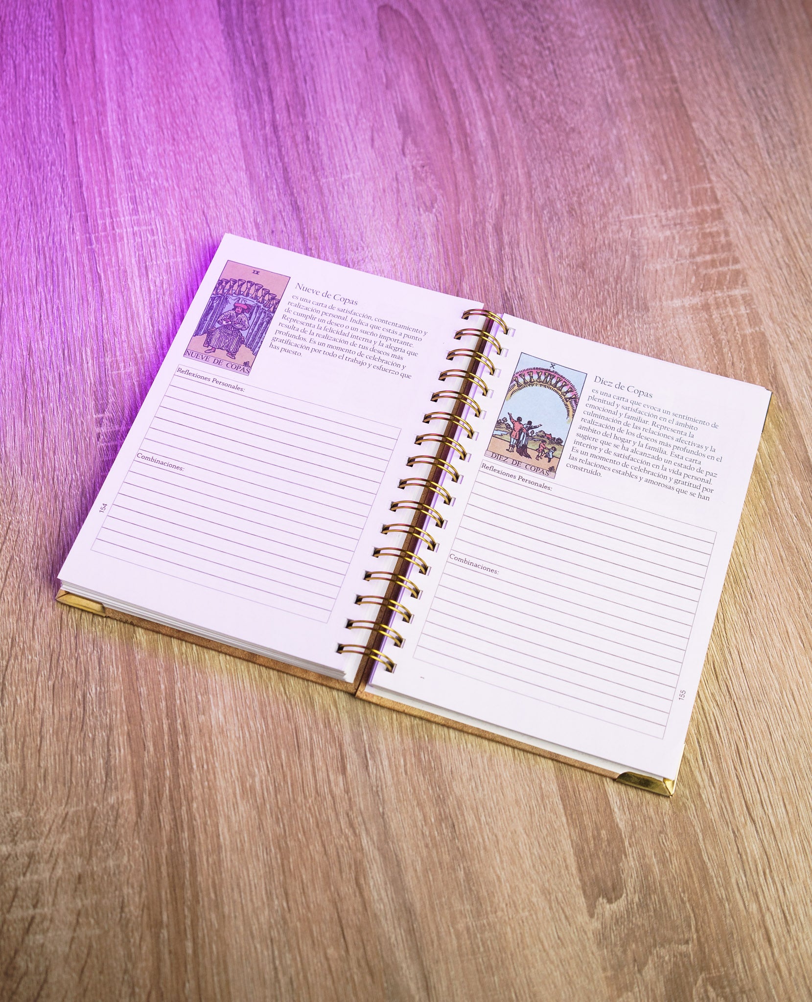 Incluye una guía completa de los 78 Arcanos del Tarot, con espacio para escribir tus propias interpretaciones, combinaciones y mensajes canalizados.
